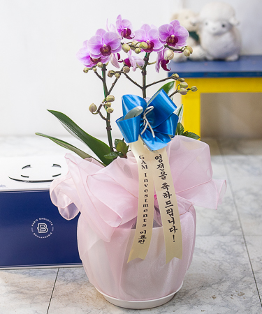 호접란을 보자기에 싸서 한껏 멋부렸습니다.