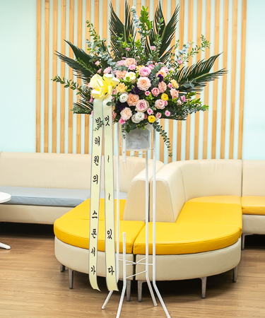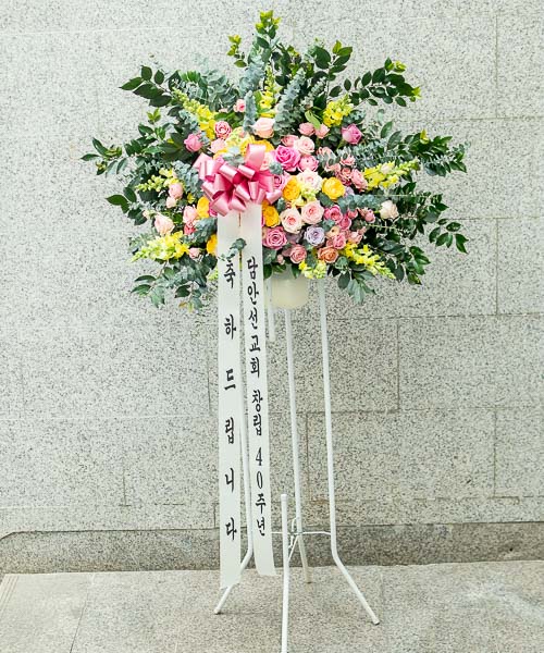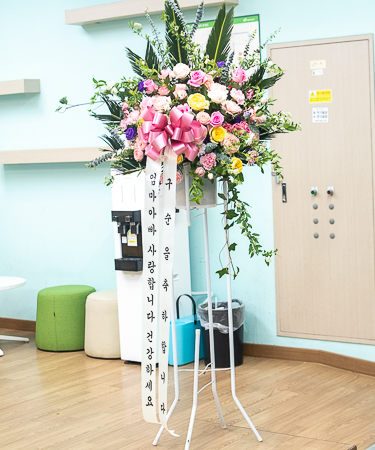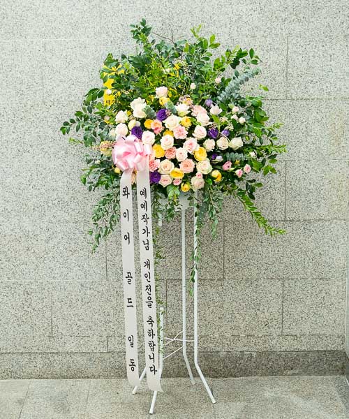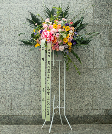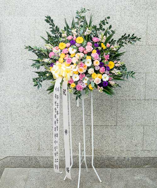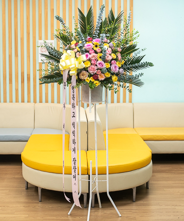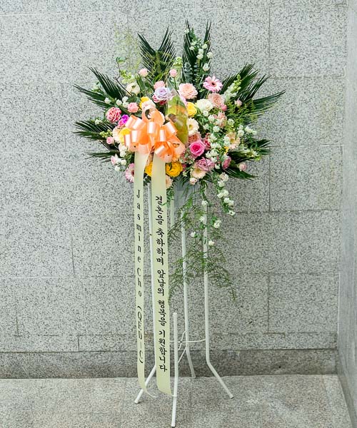 축하오브제화환은 철제 오브제 틀에 꽃을 장식하는 상품입니다.