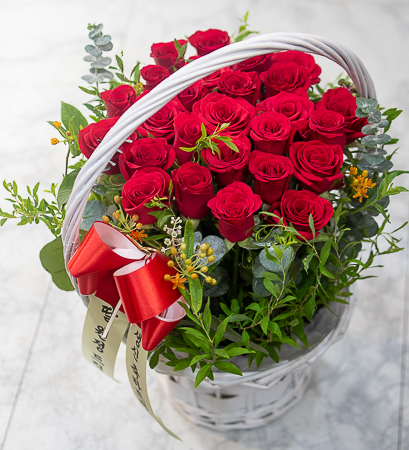 정열적이면서 낭만적인 느낌을 싱싱한 고급 빨강장미를 사용해 연출해보았습니다.오늘의 주인공이신 그분에게 정열과 낭만을 전해보세요. 네프로네프스,편백등 녹색의 소재를 사용하여 빨강장미를 더욱 강조하였습니다.