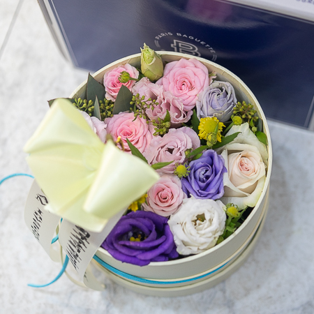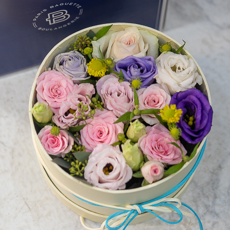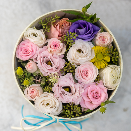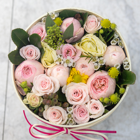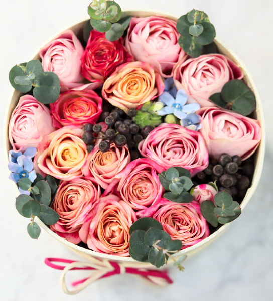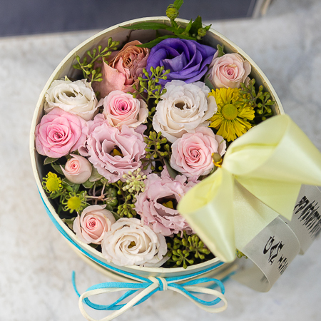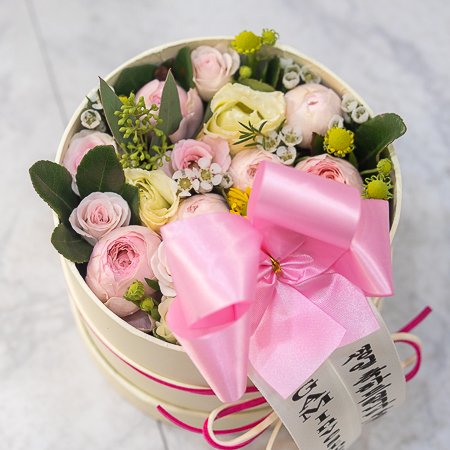 작은 장미를 작은 둥근 박스에 담았습니다.