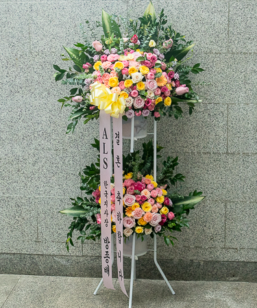 화려한 르네브와 백합,계절꽃등의 생화를 주 소재로 하여 축하의 분위기를 한껏 드높여 줍니다.