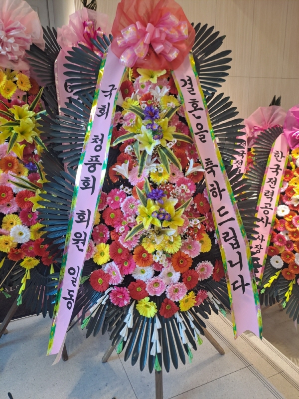 개업,결혼,칠순,준공식,연주회,기념회,발표회등 많은사람이 모이는 장소에서 큰리본과 함께 보내시는분의 정성과 품위를 느끼게 될겁니다.높이가 2m20cm이상으로 축하화환중 제일키가 큼니다.