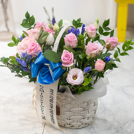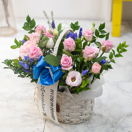 더운 여름, 시원한 핑크 장미꽃바구니