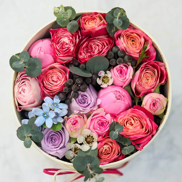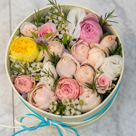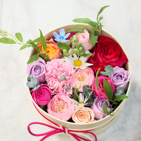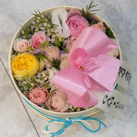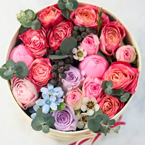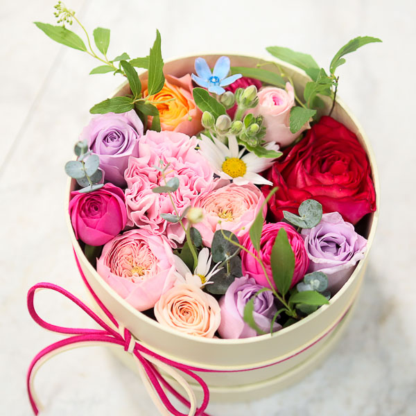 작은 장미를 작은 둥근 박스에 담았습니다.