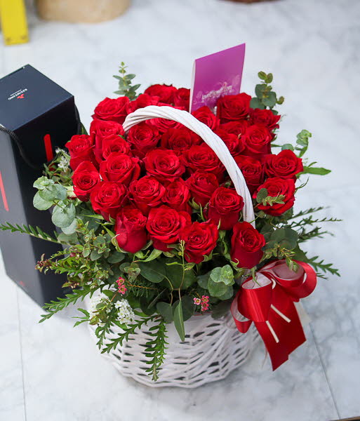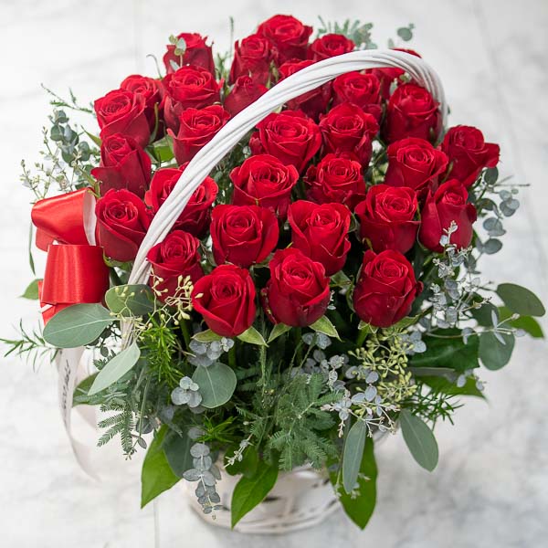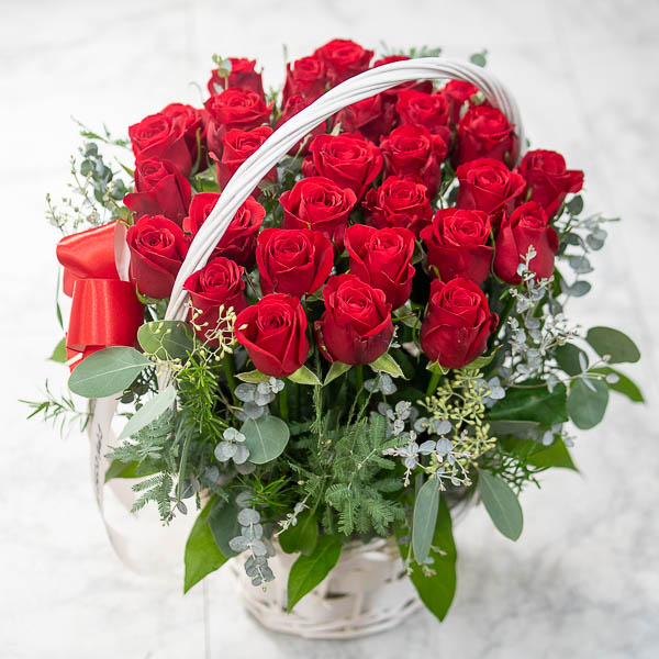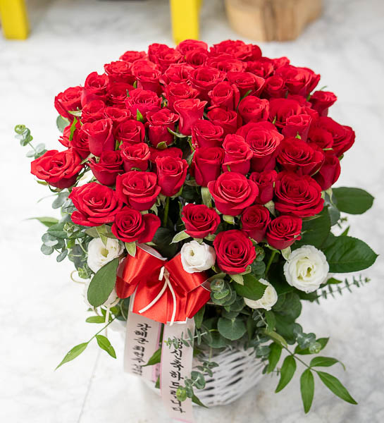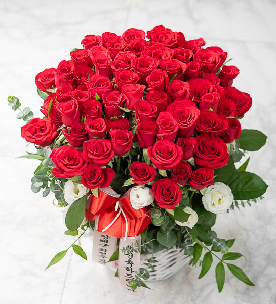 정열적이면서 낭만적인 느낌을 싱싱한 고급 빨강장미와 그린을 사용해 연출해보았습니다.오늘의 주인공이신 그분에게 행복과 낭만을 전해보세요.