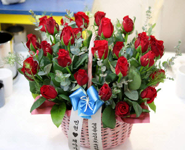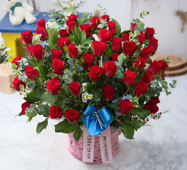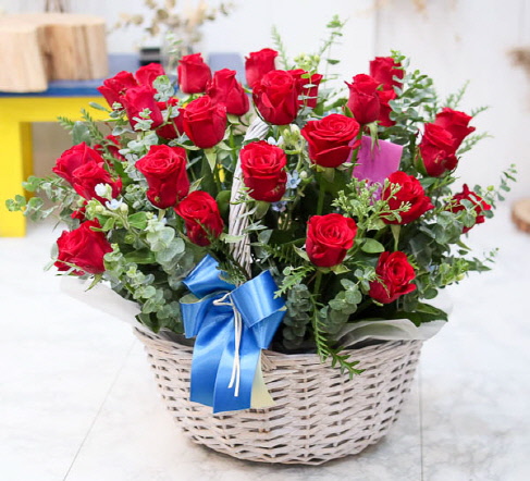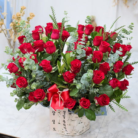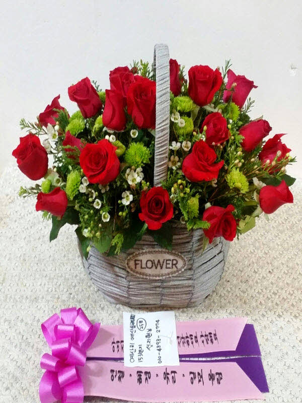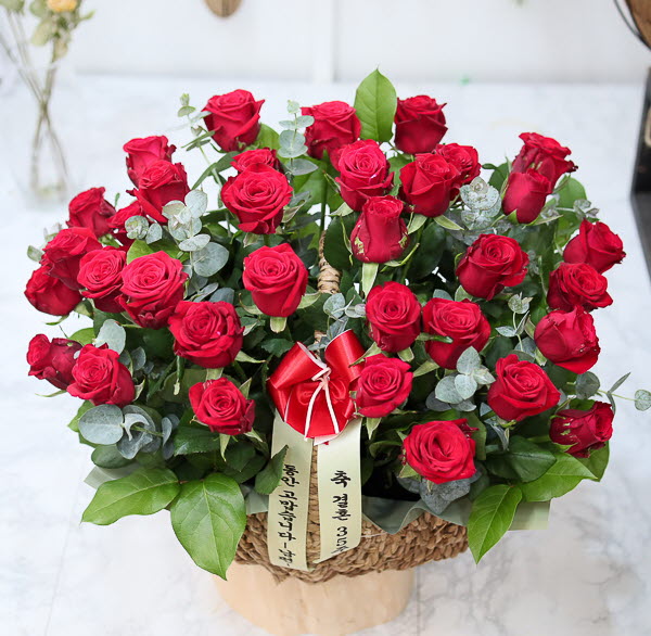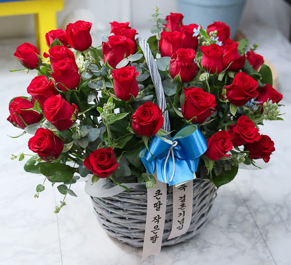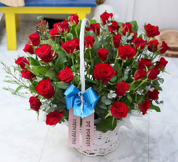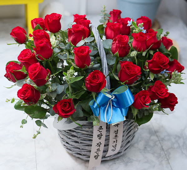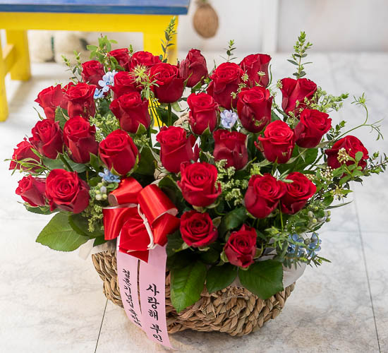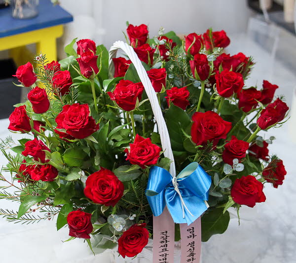 은혜 감사와 존경의 마음을 사랑과 정성을 담아 전해보세요. 환한 미소를 생각하며 세련된 빨강장미를 바구니에 시원한 녹색소재와 함께 담았습니다.