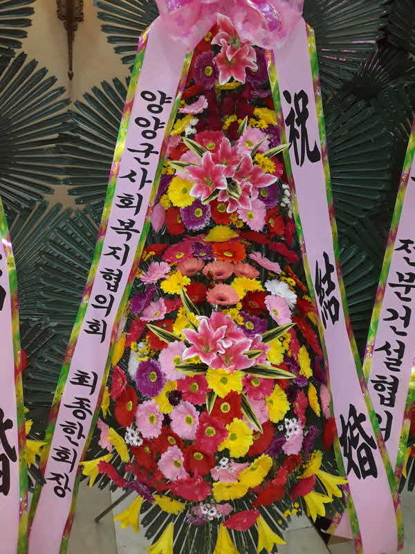 개업,결혼,칠순,준공식,연주회,기념회,발표회등 많은사람이 모이는 장소에서 큰리본과 함께 보내시는분의 정성과 품위를 느끼게 될겁니다.높이가 2m20cm이상으로 축하화환중 제일키가 큼니다.