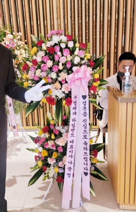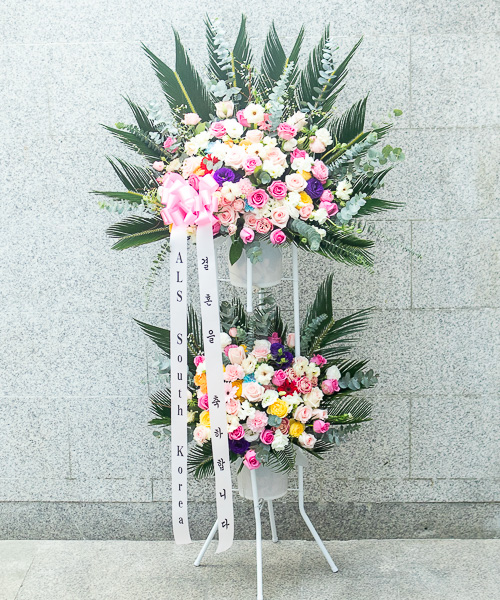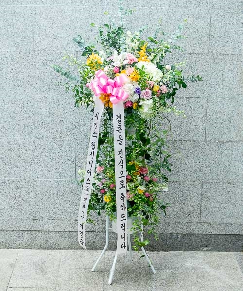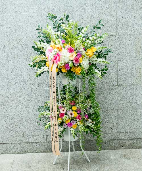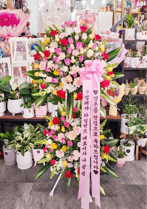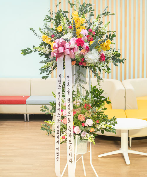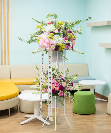 화려한 르네브와 백합,계절꽃등의 생화를 주 소재로 하여 축하의 분위기를 한껏 드높여 줍니다.