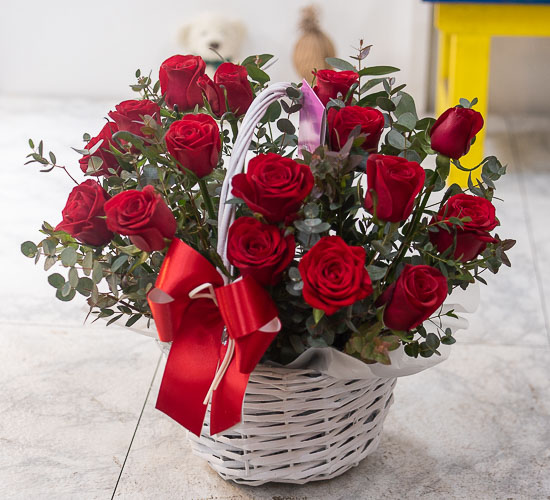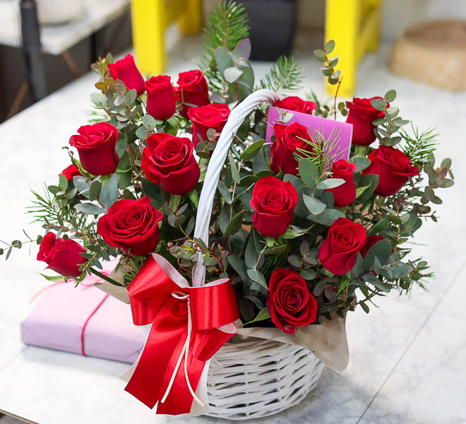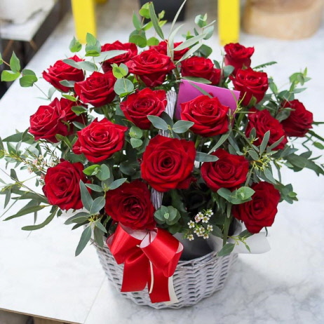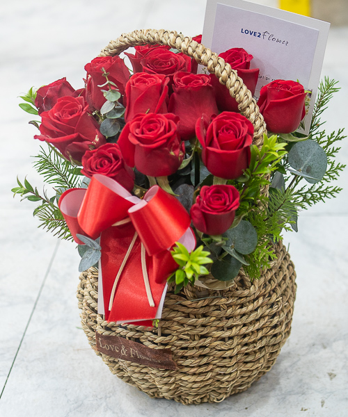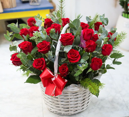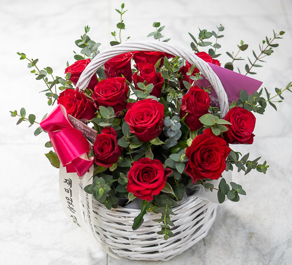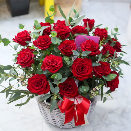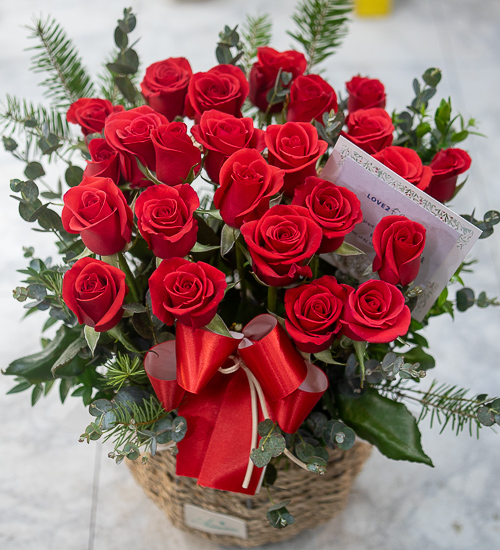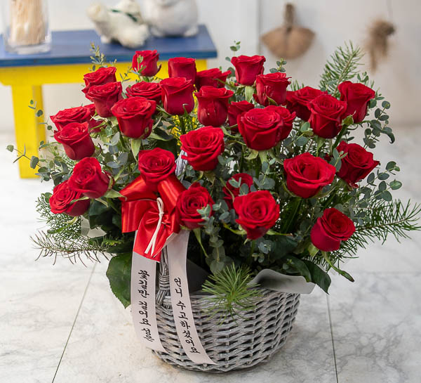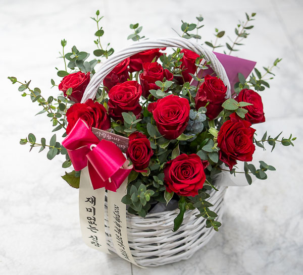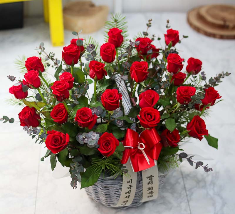 정열적이면서 낭만적인 느낌을 싱싱한 고급 빨강장미를 사용해 연출해보았습니다.오늘의 주인공이신 그분에게 정열과 낭만을 전해보세요. 네프로네프스,편백등 녹색의 소재를 사용하여 빨강장미를 더욱 강조하였습니다
